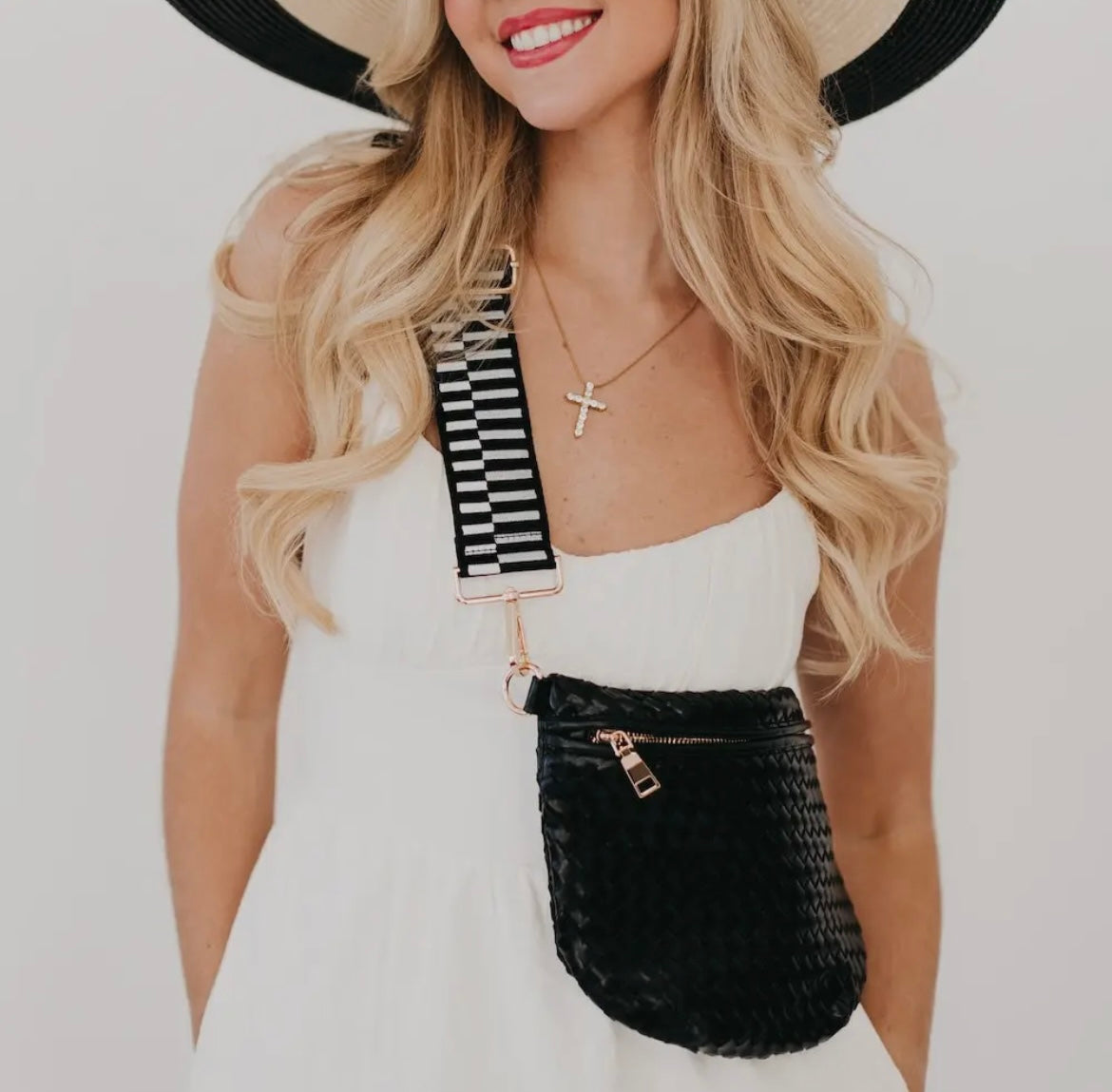 Meet the Westlyn Woven Bum Bag! Gorgeous woven vegan leather featuring beautiful hardware with a zipper closure and pocket on the inside.